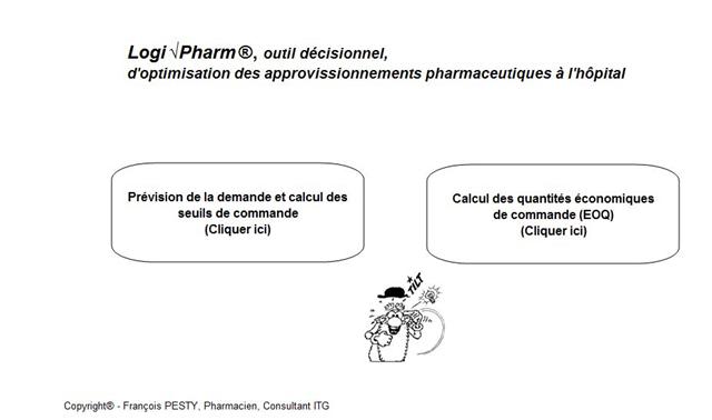 Livrables : Diagnostic "flash" - Paramétrage et livraison de l'outil décisionnel - Formation des utilisateurs La prestation comprend la réalisation d'un diagnostic "flash", le paramétrage et la livraison de l'outil décisionnel, la formation des utilisateurs, et le cas échéant, des préconisations pour la mise en place d'une organisation dédiée à la prévision de la demande et à l'optimisation de la gestion des approvisionnements et des stocks en Pharmacie hospitalière... Téléchargez la version de démonstration de l'outil décisionnel, Logi√Pharm® (Peut-être vous faudra-t-il « Activer les macros » et / ou modifier les options de sécurité des macros – ou encore sera-t-il nécessaire d'installer des macros complémentaires. Voir le tutoriel mentionné ci-après ; La version de démonstration a été développée en version Office 2003 avec comme système d'exploitation Windows XP ; Si votre version Microsoft Office est plus récente, il est préférable d'enregistrer le fichier sous version Excel 97 à 2003 ; Si votre poste de travail est sous Windows Vista ou Windows 7, télécharger le fichier suivant : LogiPharm_Demo_w7) ; Téléchargez le tutoriel de « téléchargement et démarrage de l'application » ; Téléchargez le tutoriel relatif au module « Prévision de la demande et calcul des seuils de commande » ; Téléchargez le tutoriel relatif au module « Calcul des quantités économiques de commande » ; Télécharger la présentation des prestations associées à la fourniture de l'outil décisionnel ; Téléchargez la présentation de 10 études de cas réalisées avec Logi√Pharm® ; Téléchargez l'ensemble du "pack" de démonstration, sous forme d'une archive zippée (6,9 Mo) : ici